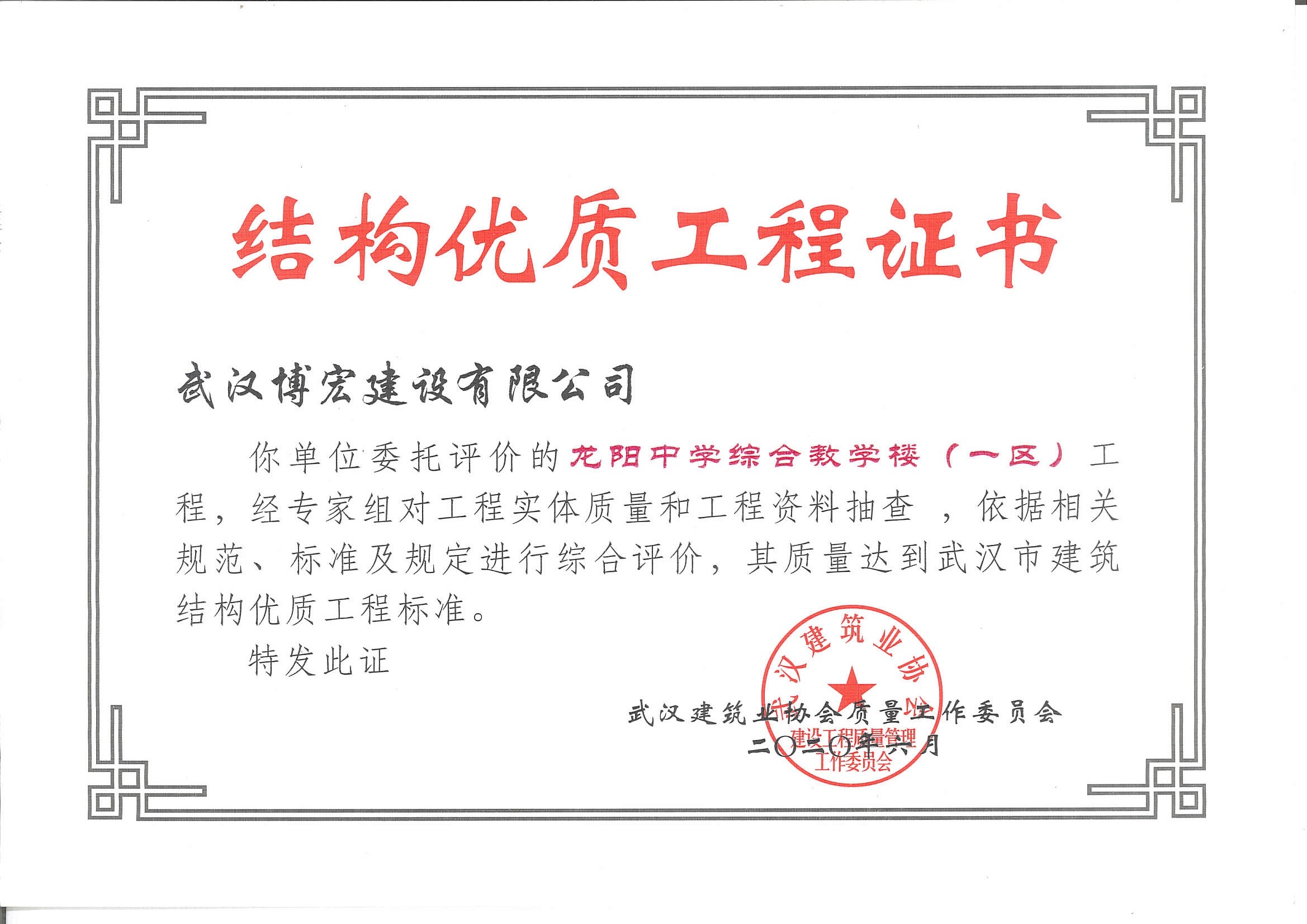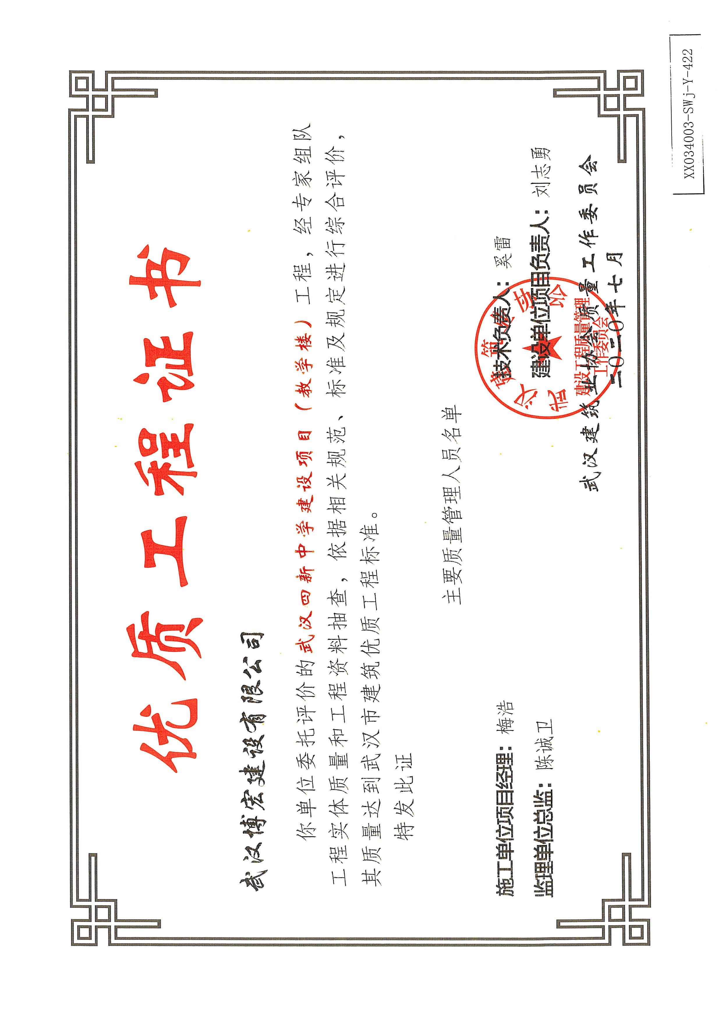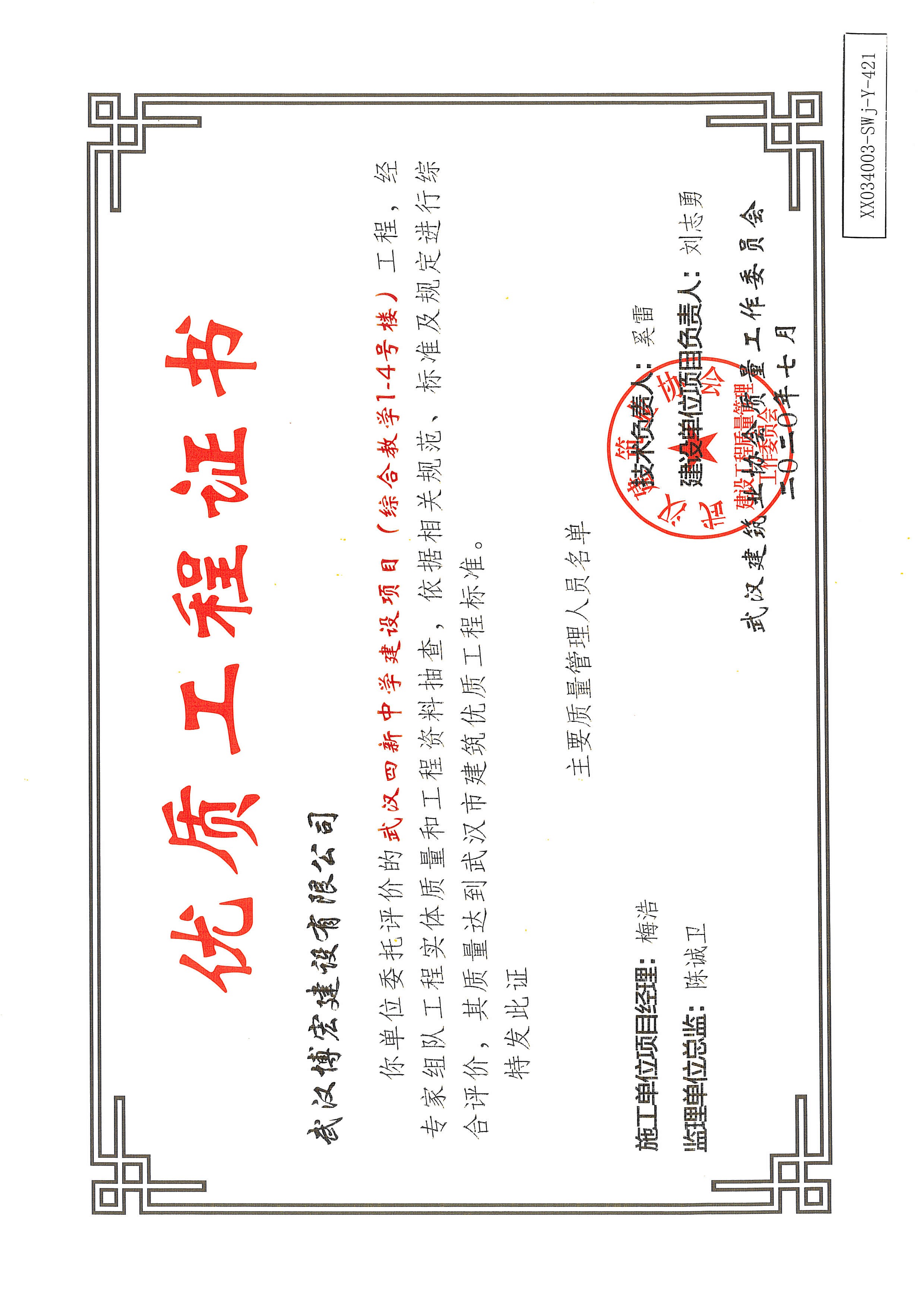 優質工程證書(武漢四新中學建設項目工程(綜合教學1--4號樓)