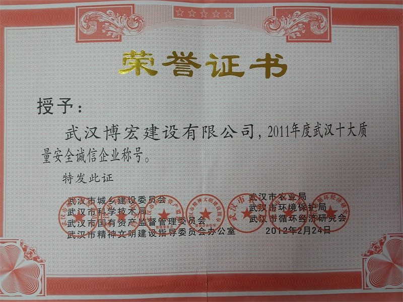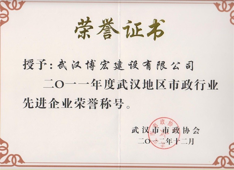 2011年度武漢地區市政行業先進企業榮譽稱號