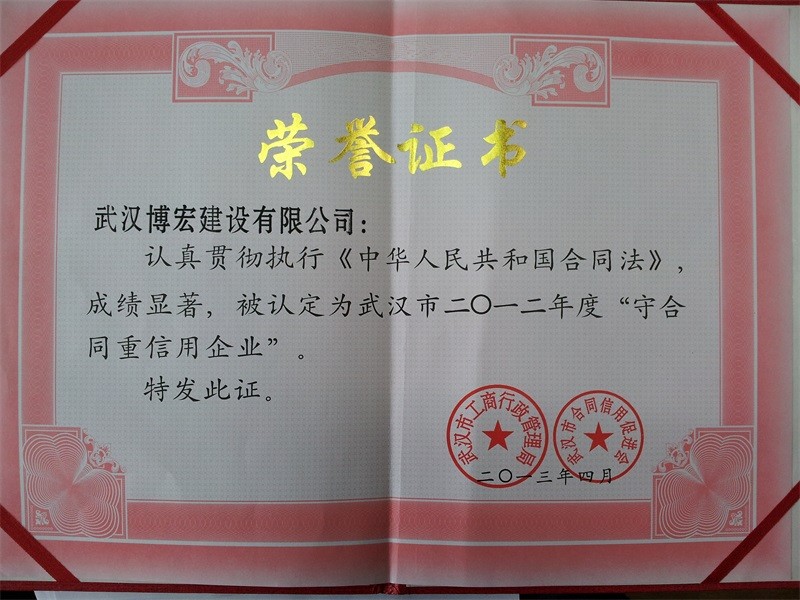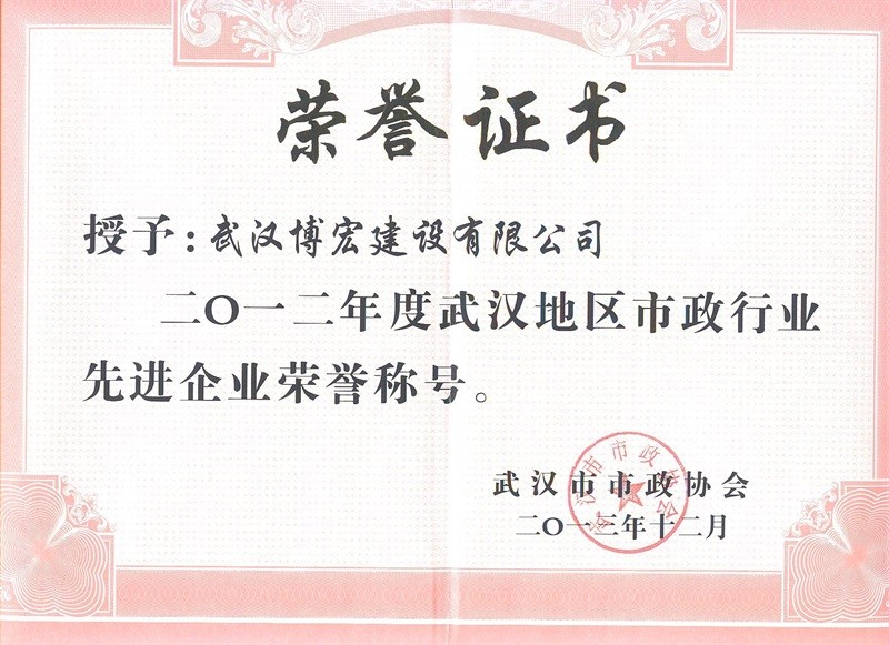 2012年度武漢地區市政行業先進企業榮譽稱號