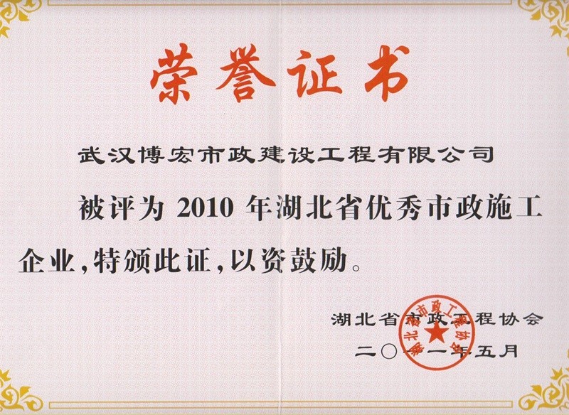 2010年度武漢地區市政行業先進企業榮譽稱號