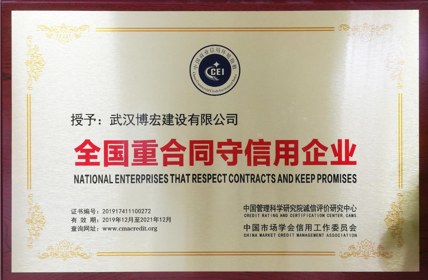 ???? 近日,博宏建設被中國管理科學研究誠信評價研究中心、中國市場學會信用工作委員會共同評為“全國重合同守信用企業”,以表彰公司在嚴格按照合同內容來實施、執行項目建設和公司管理方面的誠信行為。