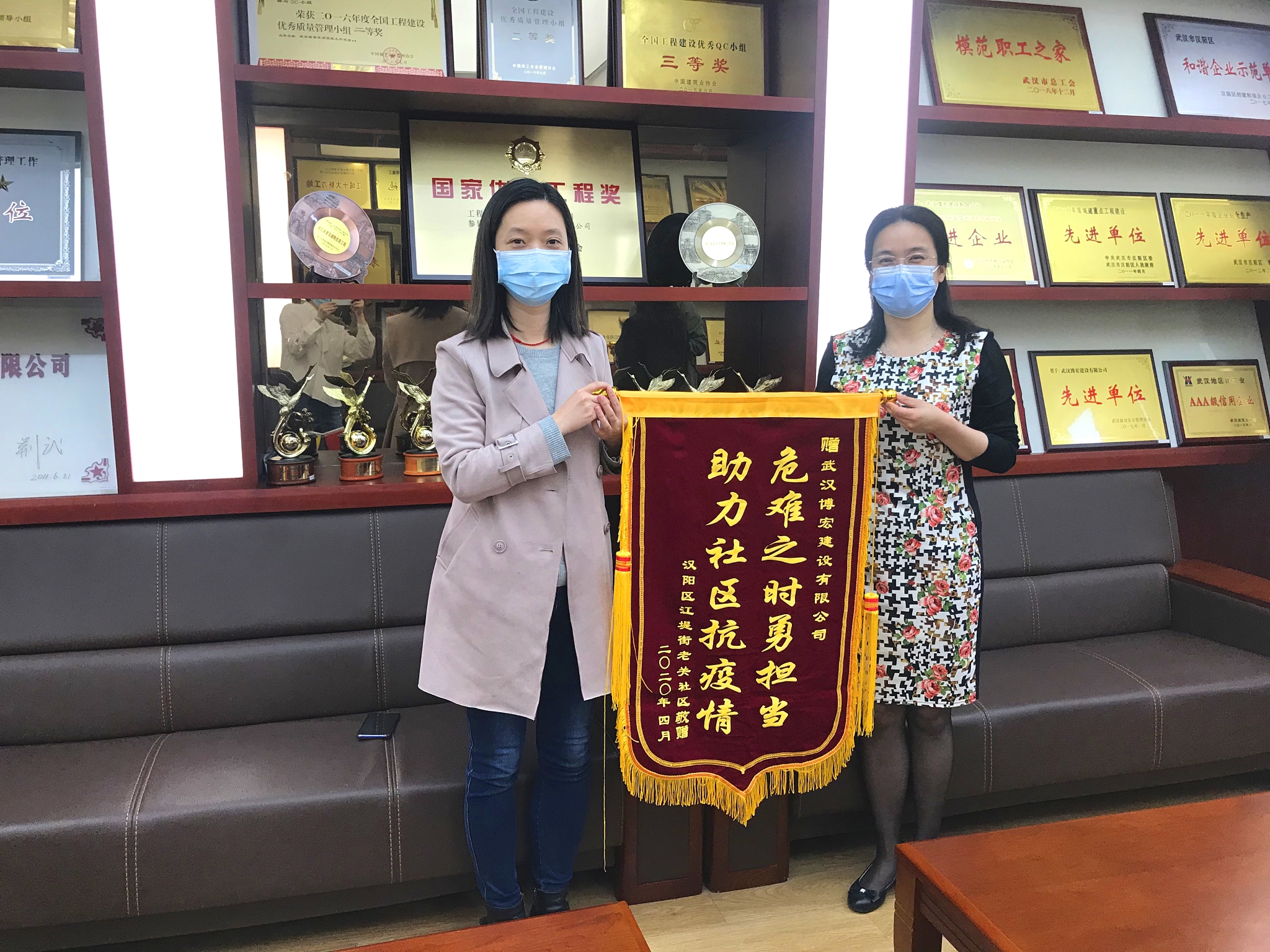427日上午,武漢市漢陽區江堤街老關社區書記馮霞懷著一份感恩的心,將一面印有“危難之時勇擔當,助力社區抗疫情”的錦旗送到博宏建設支部副書記郭一清的手中,感謝博宏建設在疫情期間主動為社區提供生活保障物資的善舉。