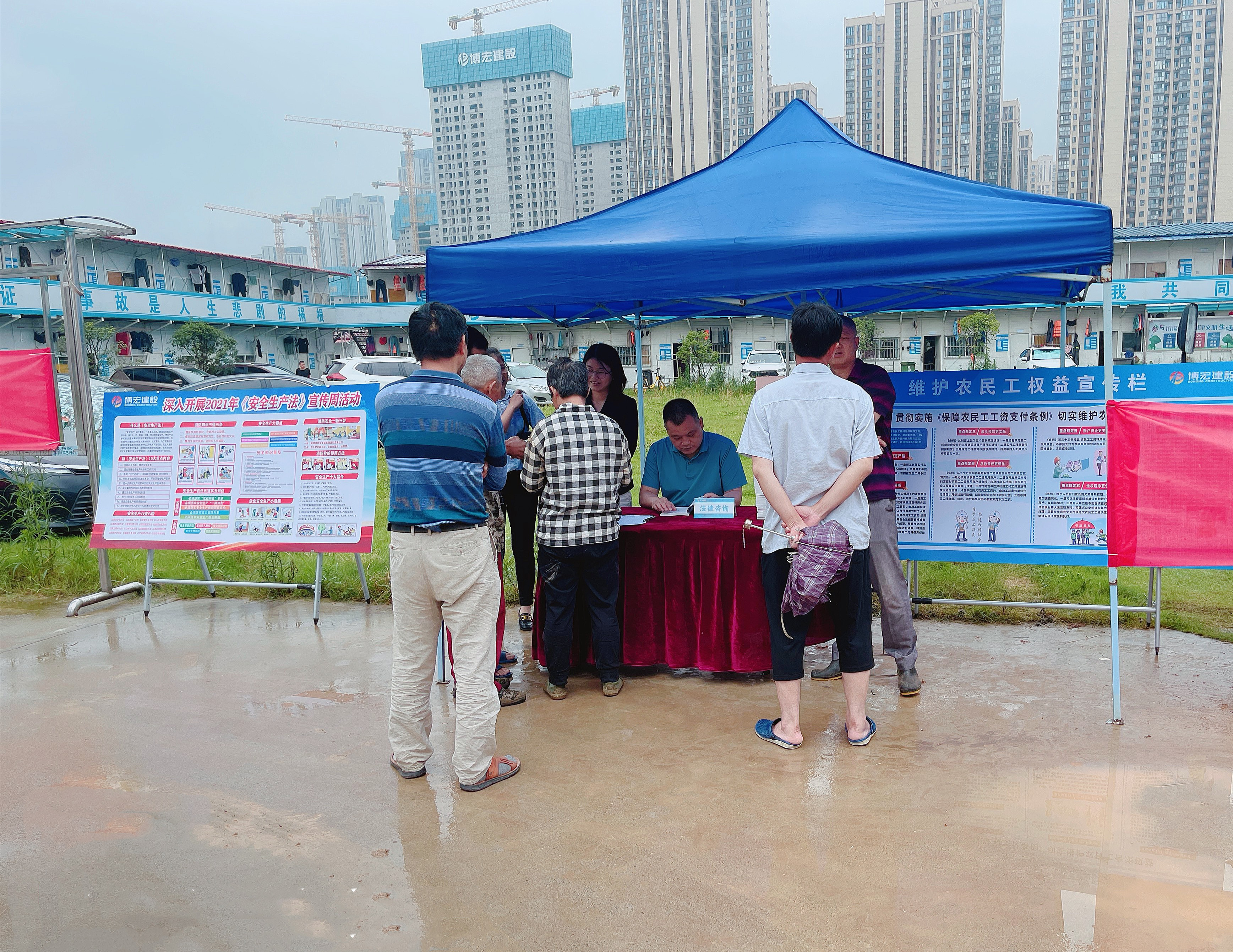 6月19日下午4點,“送法進工地”普法宣傳活動在漢陽市政大廈項目部舉辦。活動現場通過懸掛橫幅、發放普法書籍、法律咨詢等形式向在場的農民工、項目一線員工宣傳與安全生產、農民工權益保護相關的基本知識。