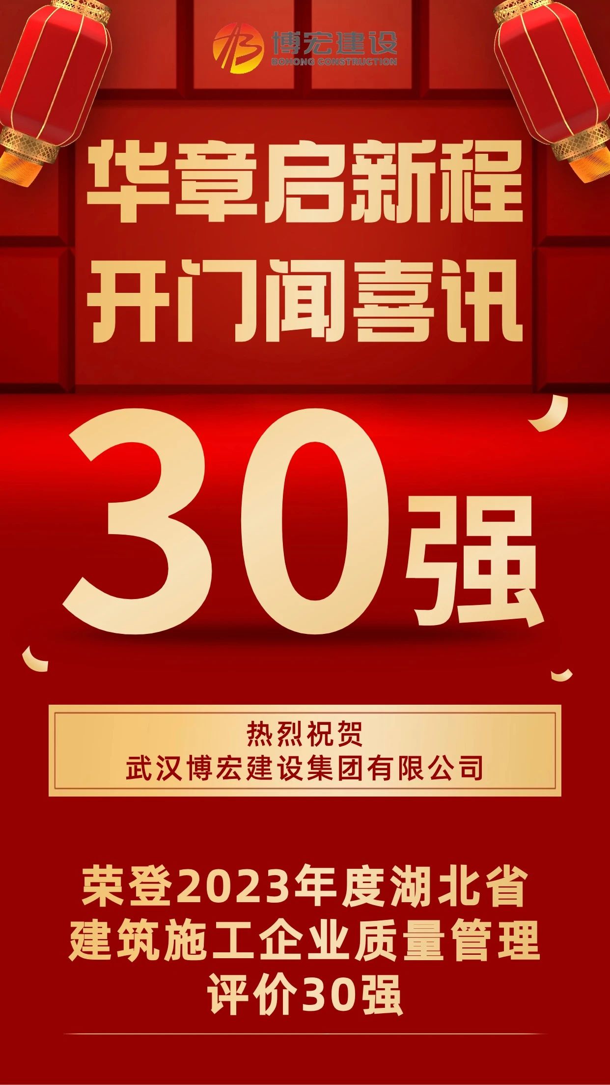 華章啟新程,開門聞喜訊。近日,湖北省建設工程質量安全協會公布2023年度湖北省建筑施工企業質量管理評價30強名單,博宏建設集團榮耀登榜!此次上榜是博宏建設集團繼2022年榜上有名后,再次憑借卓越的質量管理和施工實力登上榜單。